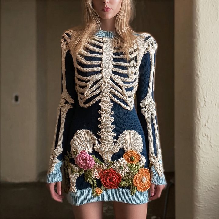 Halloween Skeleton & Floral Embroidery Women's Knit Sweater