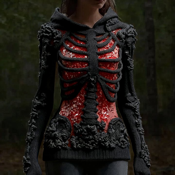 Halloween Skull Floral Knitted Warm Hooded Sweater