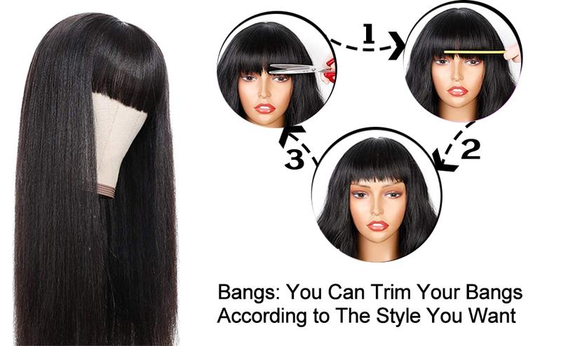 [New In]Straight Wigs with Bangs Human Hair 2x4 Lace Wig with Drawstring 180% Density Middle Part for Black Women Glueless Machine Made Wigs